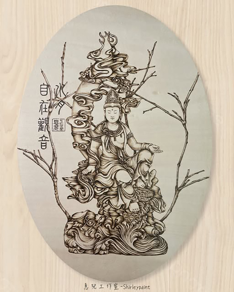 是一件以電燒燒烙技巧製作的藝術品。這幅作品將觀音菩薩的形象呈現在木板上,透過電燒工藝,每一條線條和細節都以燒刻的方式鮮活地展現。