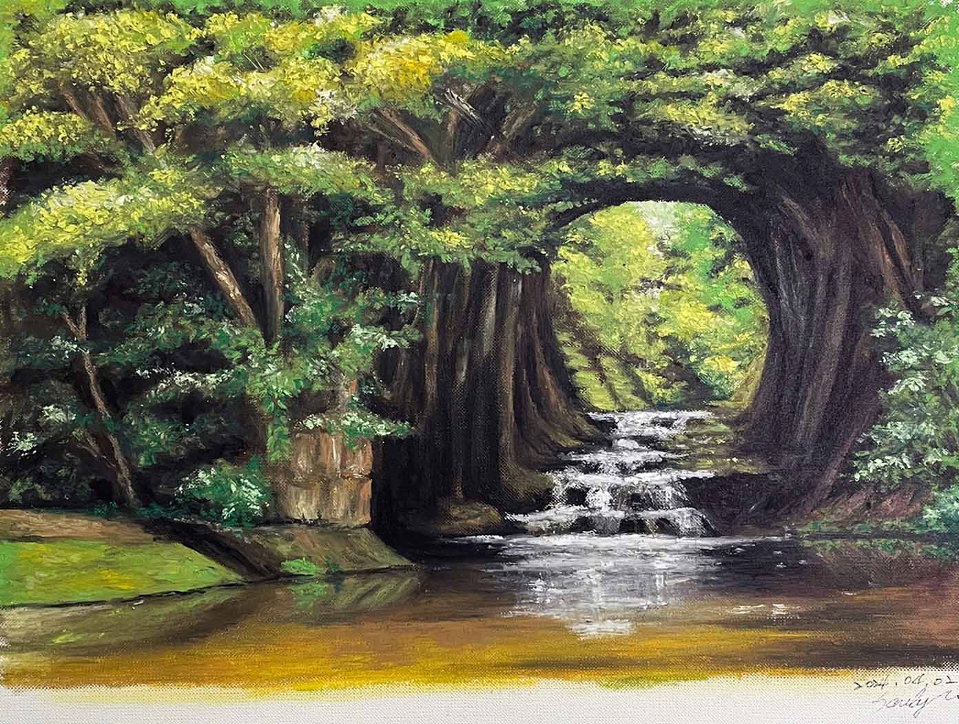 「濃溝幽瀑」這幅作品旨在捕捉千葉県君津市的濃溝之美,特別是其中的濃溝瀑布景觀。我選擇使用油畫棒作為媒材,因為它們能夠提供豐富的色彩和質感,使得我能夠更好地表現出瀑布的流動感和周圍景色的豐富細節。