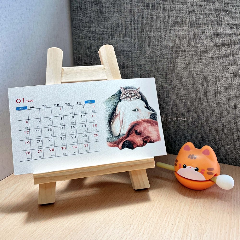 以20 x 11 CM的精巧尺寸,搭配溫潤的小木畫架,為您的空間增添溫馨與個性。月曆採用優質220g水彩紙,每一頁都以水彩手法繪製,完美呈現寵物的可愛與靈動。