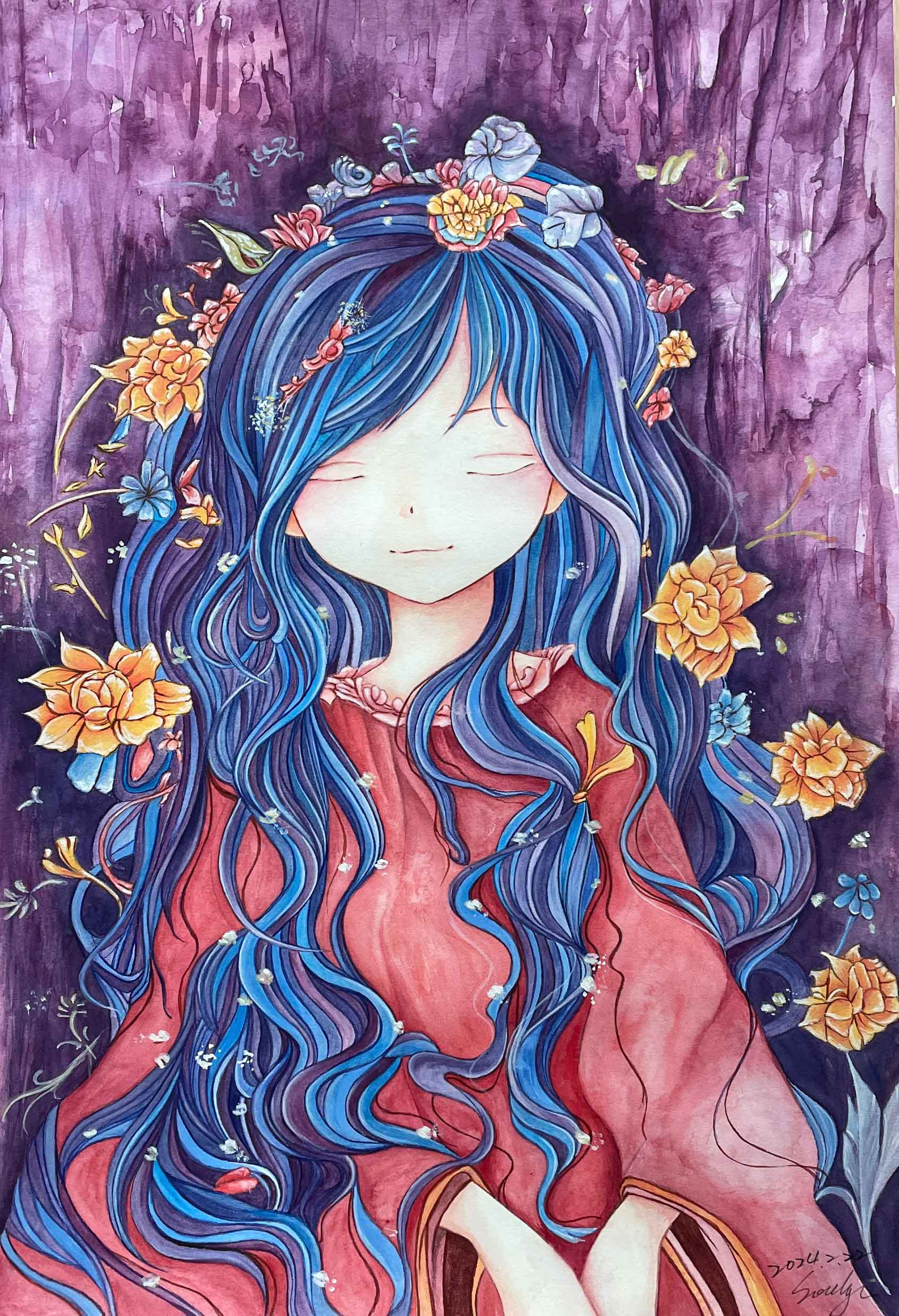 在這幅畫作中,我試圖捕捉到一個純真孩童與大自然相互擁抱的場景。透過中國古彩水性顏料,我將主角小女孩、花、碎花和小碎草以藍色和紫色繪製,這些色彩象徵著夢幻和自然的神秘感。
