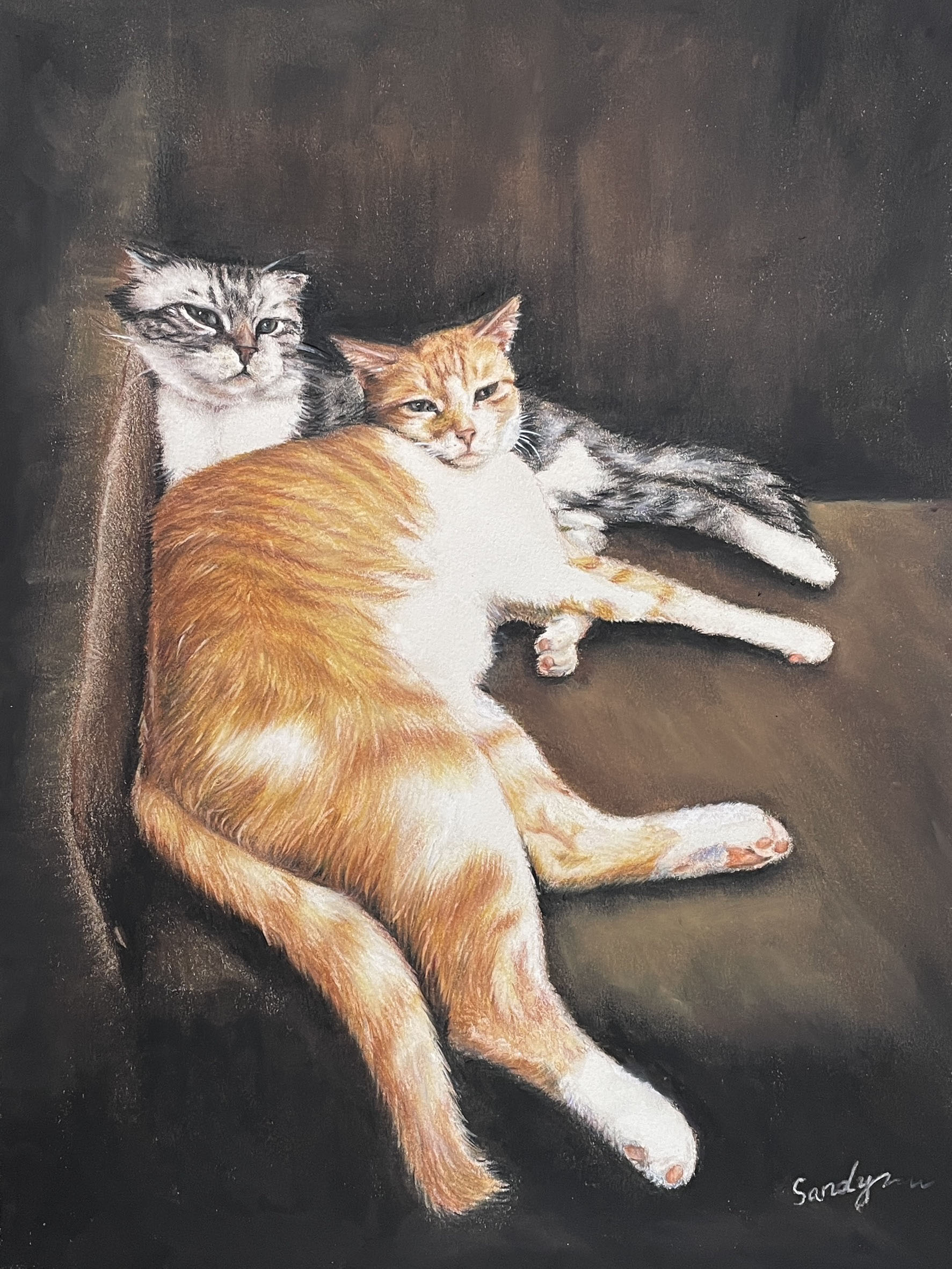 這幅作品以兩隻愛貓為主角,以色鉛筆與油畫棒交織出深刻的情感層次與細膩紋理。
