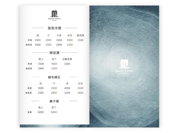 本次設計的 美髮店價目手冊 以 「專業 × 優雅 × 奢華」 為核心概念,選用 藍色大理石紋 作為主視覺,營造出沉穩高貴的氛圍,讓顧客在翻閱手冊時,即可感受到品牌的專業度與獨特風格。