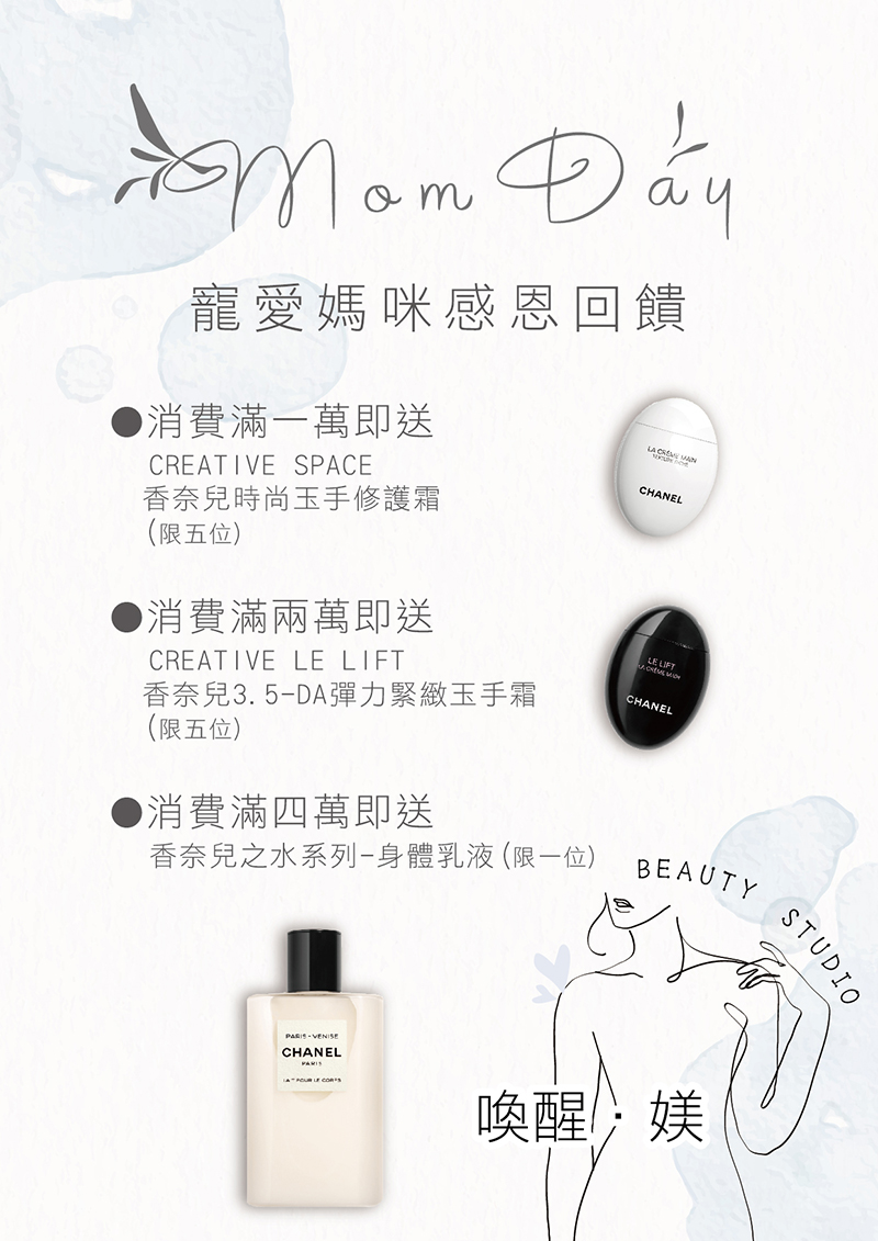 產品呈現與層次設計-透過 錯落排版,讓三款香奈兒贈品各自擁有專屬空間,視覺上既和諧又突出重點。白色與黑色的對比也增強了質感,強調不同產品的獨特性。