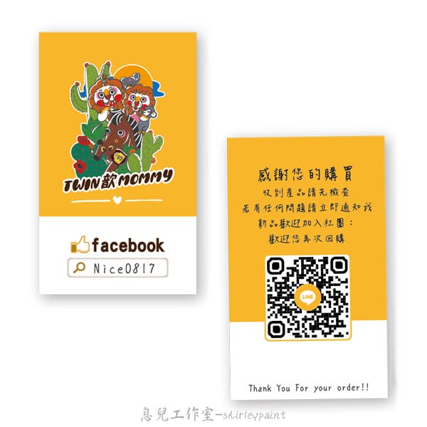 背面則結合 感謝詞、QR Code 與社群資訊,讓顧客能夠方便聯繫與回購。