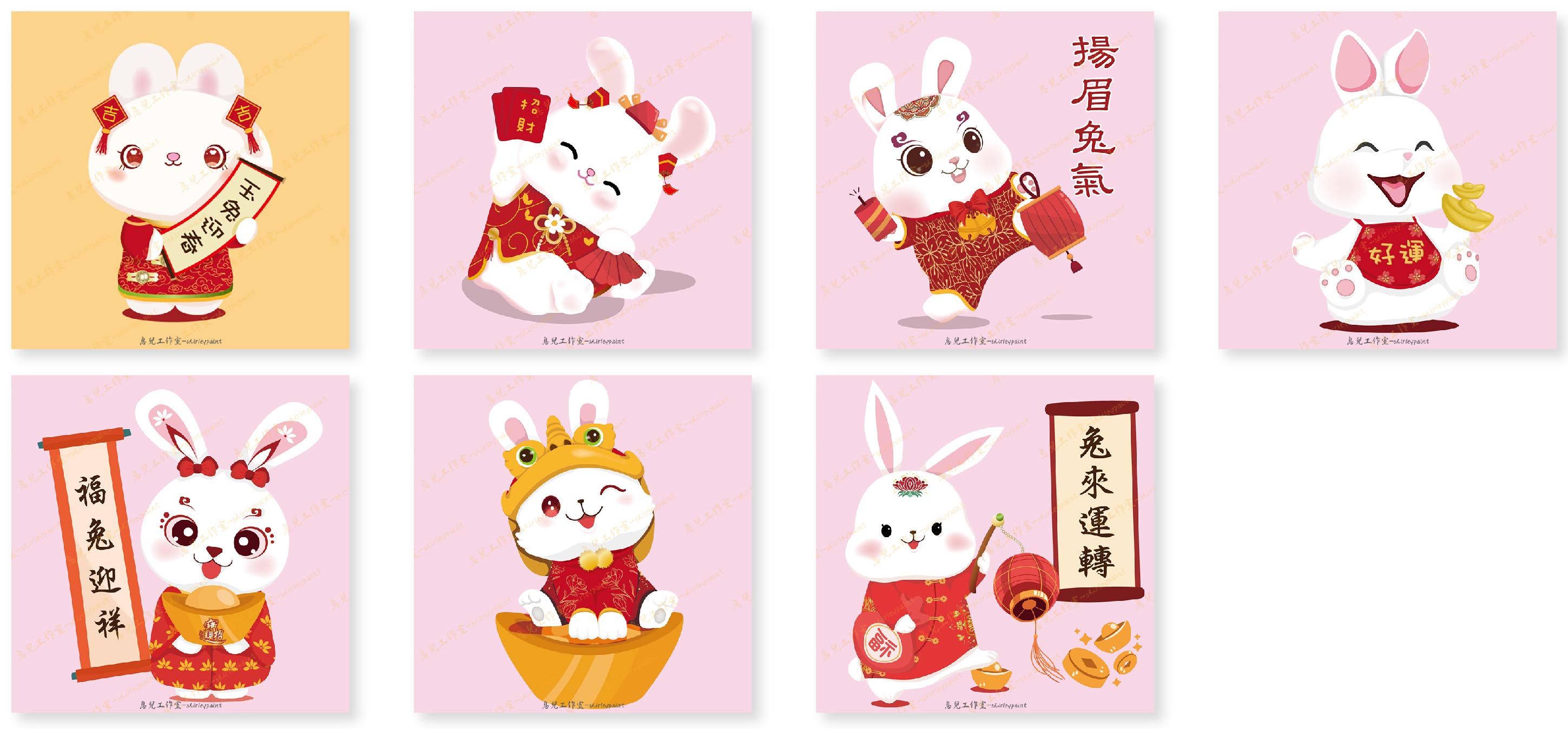 玉兔迎春·祥瑞滿門2023兔年Q版賀歲插畫設計 數位插畫 首頁 數位插畫作品 玉兔迎春·祥瑞滿門 | 2023兔年Q版賀歲插畫設計 玉兔迎春·祥瑞滿門 | 2023兔年Q版賀歲插畫設計 | 2022年10月28日 設計創作概念 這組Q版兔年數位插畫,以可愛生動的兔子角色結合 新年傳統元素,為 2023癸卯兔年 營造滿滿的吉祥氛圍。 兔子象徵 溫柔、機智與繁榮,與春節喜氣的紅色、金色搭配,傳遞美好祝福。 這些兔年插畫作品適用於 春節賀卡、紅包設計、年節文宣、社群貼圖 等多種用途,讓 2023兔年 充滿溫馨與幸福! 歡迎與我們聯繫 有任何服務需求,歡迎與我們聯繫,我們會在1-2個工作天與您聯繫,感謝您!!If you have any service inquiries, feel free to contact us.We will get back to you within 1–2 business days. Thank you! 官方LINE客服 Facebook粉絲專頁