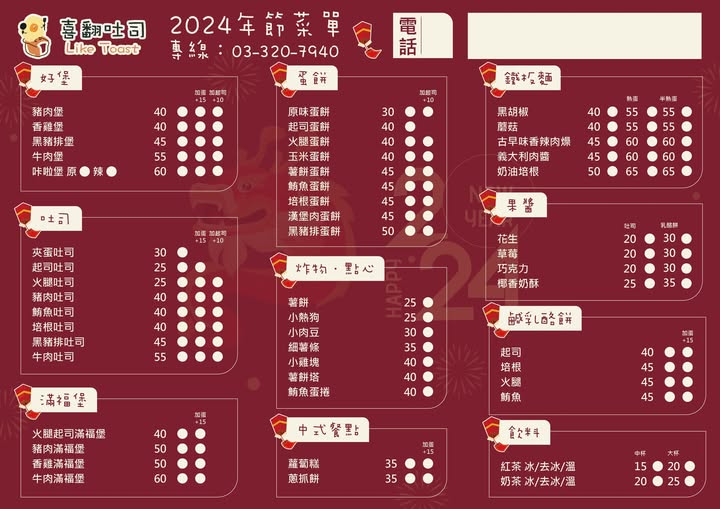 菜單使用區塊化的設計,將各個品項分類清楚,從吐司、早餐餅、鍋燒意麵到飲品等,一目了然,方便顧客快速找到想點的餐點。價格與品項以清晰的白色字體呈現,讓資訊更加醒目易懂。