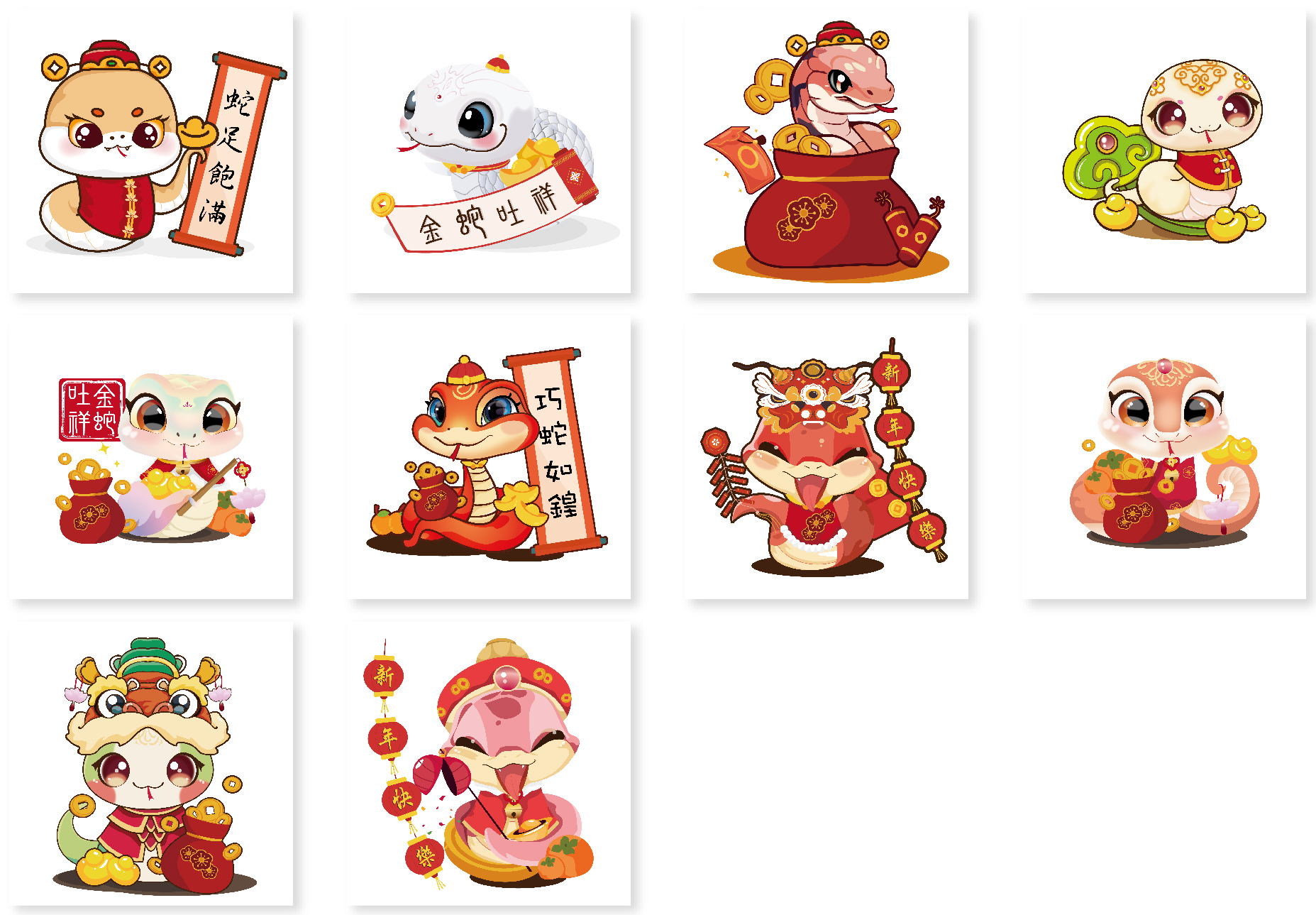 這組Q版蛇年數位插畫以活潑可愛的風格,將傳統生肖文化與新年吉祥元素結合,打造出一系列充滿喜氣的蛇年賀歲角色。
