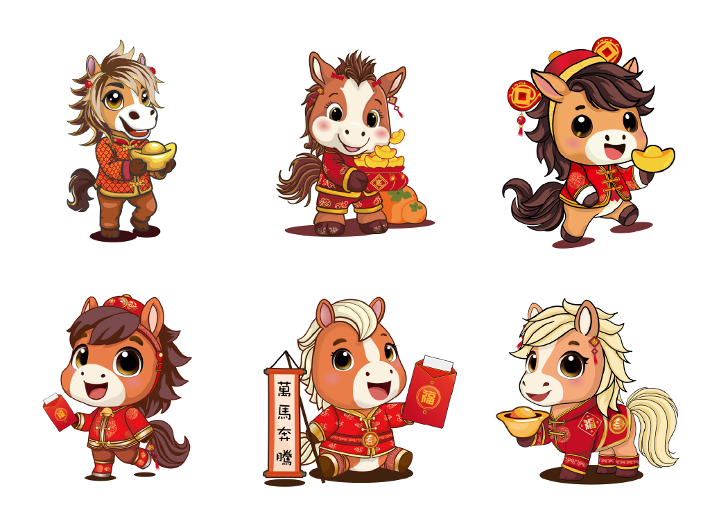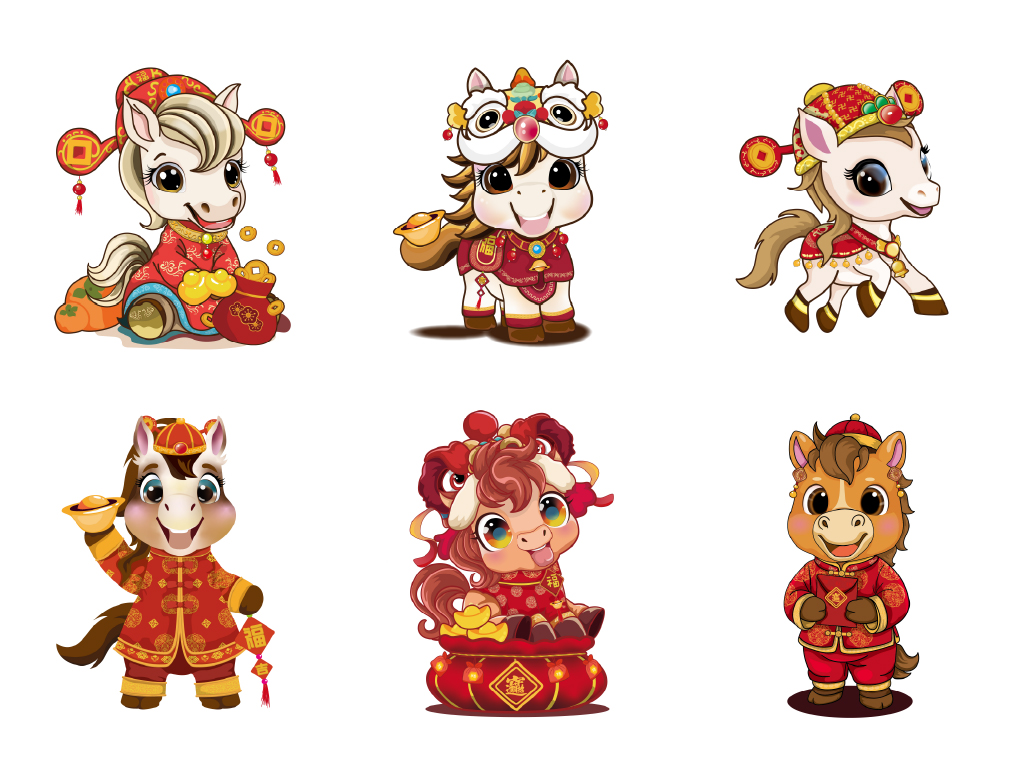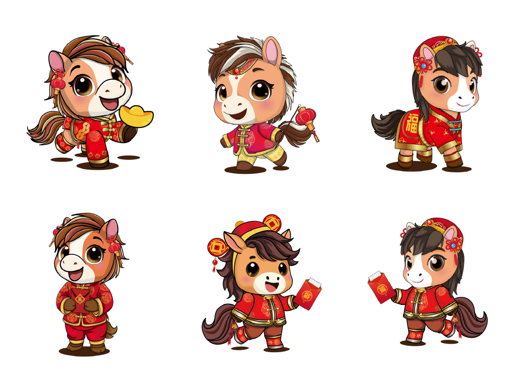 這次我們設計了一系列Q版兩頭身馬年吉祥物,不僅全身穿上喜氣的中式新年服裝,更手捧象徵財富的金元寶,傳遞幸福與好運🎉!